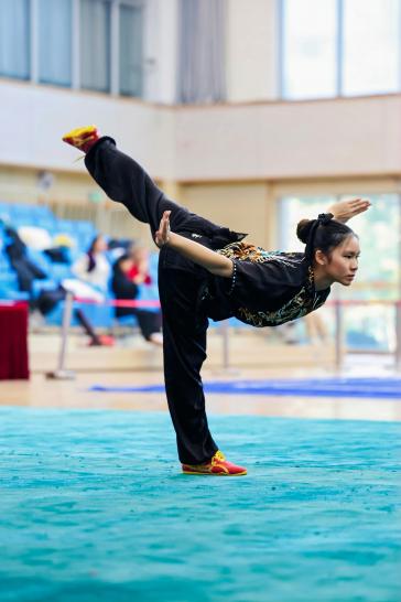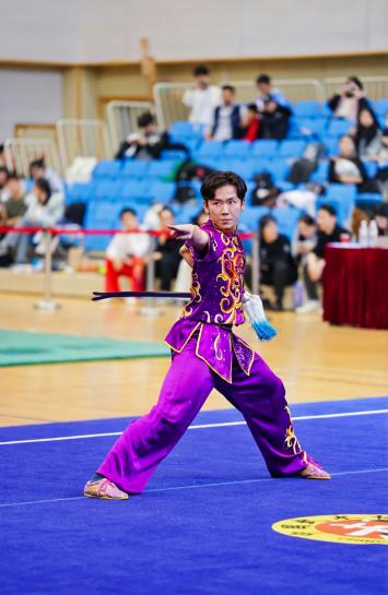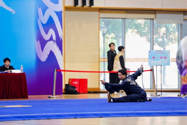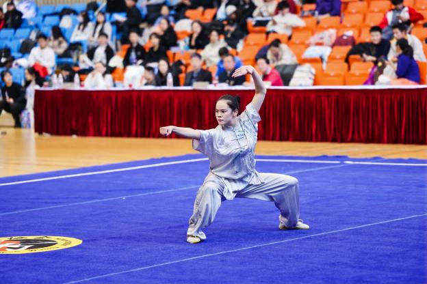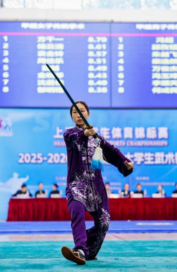 比赛一开始,各高校代表队迅速进入状态,赛场上亮点纷呈,赛场边,各高校的教练与替补队员组成“后援团”,不时为参赛队友呐喊助威。在男子甲组太极拳项目中,上海中医药大学选手李圣敏身着传统太极服,起势如静水深流,云手、单鞭等动作舒展圆活,呼吸与招式精准配合,将太极拳“以柔克刚、以静制动”的精髓展现得淋漓尽致,一套动作完成后,现场观众自发响起掌声。女子项目赛场同样精彩迭出。上海交通大学选手王姝寒的女子甲组剑术表演,剑光闪烁间身法灵动,点、刺、劈、撩等动作干净利落,整套动作既有“剑走轻灵”的飘逸之美,又不失“刚劲有力”的竞技张力。