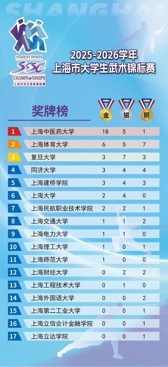经过一天紧张激烈的角逐,我校武术队获18金5银1铜的优异成绩,其中高水平武术队获9金3银,普通大学生组成的武术队获9金2银1铜,充分展现了学校体医融合育人模式的丰硕成果。当前,在“健康中国”战略深入推进与体教融合政策全面实施的背景下,学校将持续深耕武医融合特色育人路径,通过完善高水平运动队培养体系、打造精品武术文化课程、建设传统体育基地等举措,让中华优秀传统文化在校园落地生根,为国家培养更多既懂传统智慧、又具强健体魄的复合型人才,为新时代体育事业与中医药事业协同发展注入青春力量。
